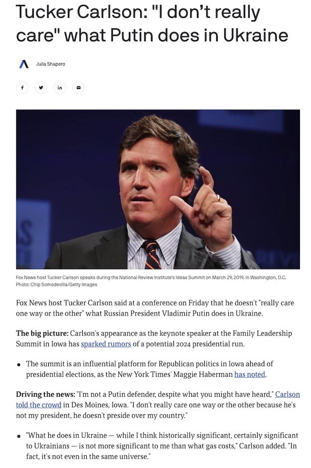 Thanks to News Corp, Tuckyo Rose, the GOP and all the other rats in the ranks, the GOP wins in November, rejects all assistance to Ukraine, helps Vlad the sociopathic impaler to his booty, and tears up the NATO treaty as the mango Mussolini wanted ...