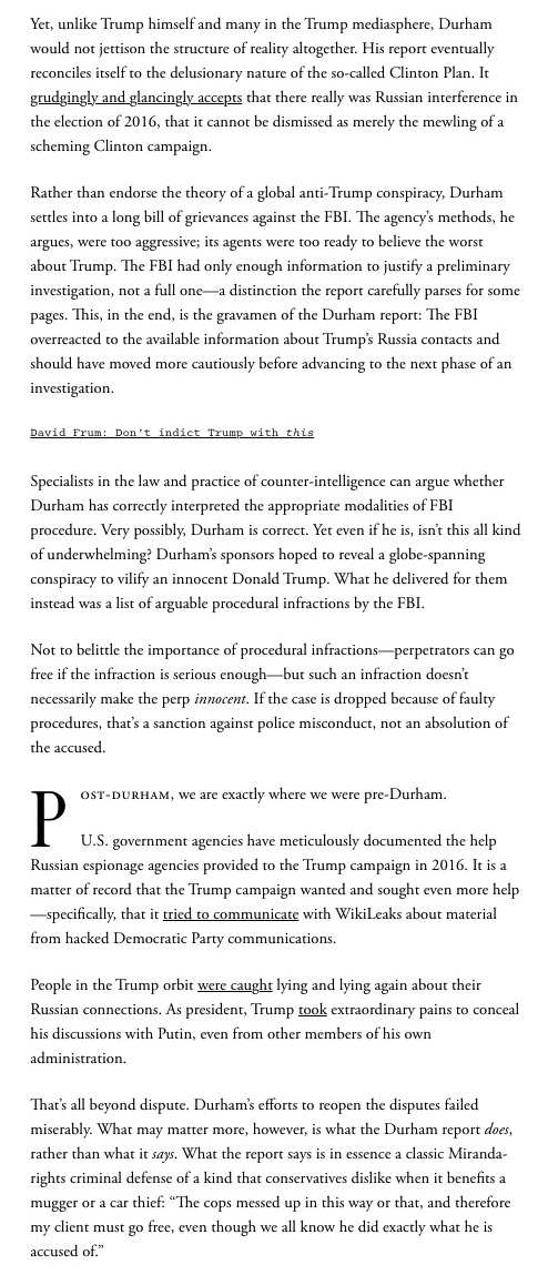 As for the Durham report, everybody the pond has consulted, including Steve Bannon, has deemed it a dud of the first water.