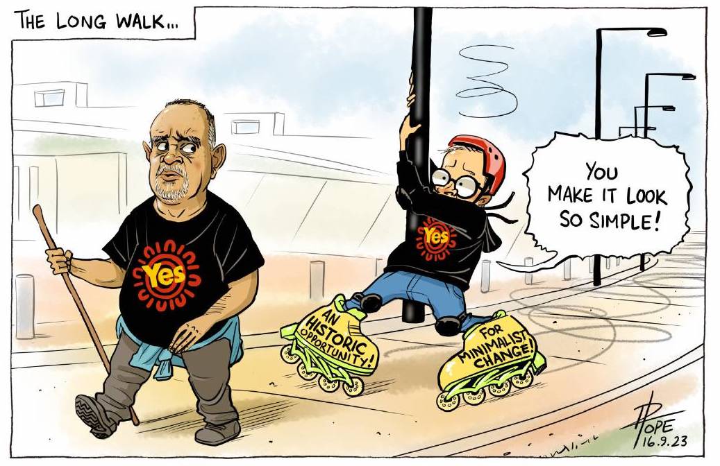 Oh, but what the Bov puts into Albanese's mouth: "A reform as historic as this ... needs bipartisan support." No it doesn't, Doggy Bov, it needs decency and rationality - and even maybe some sense and sensibility - on "both" sides, and all it's got from the "right-of-centre" is lies and hatred and racism. Plus the abject stupidity of claiming that colonialism has had no lasting effects in Australia from a genuine 'half caste Aunty Thoma' whom it appears is projecting her own comfortable state onto many, many others who are still suffering.
