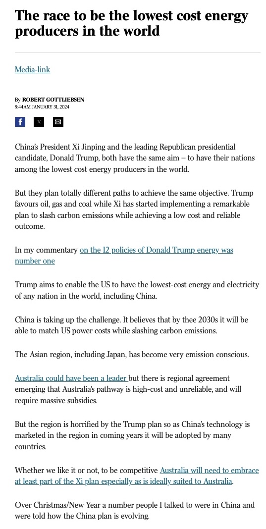 The Gottster then breathlessly informs us that some years ago, Air Power Australia “discovered” that China was experimenting with a new form of nuclear power in its submarines, and that these “molten salt Thorium generators” are the wave of the future. I’d never previously heard of Air Power Australia, but they appear to be defence-issues think tank of some sort - https://www.ausairpower.net/. I’m not sure how such an organisation would be in a position to discover hitherto-secret foreign power technologies, but it’s possible that in Gott’s world, APA is some sort of high-powered public institution, with a reach far beyond that of some pissy little self-styled “think tank”. BTW, does anyone know whether these thorium generators actually a practical option in the real world, and if so why don’t we hear more about them? Or do they at best fall into the same “maybe, one day, perhaps” category as SMRs?