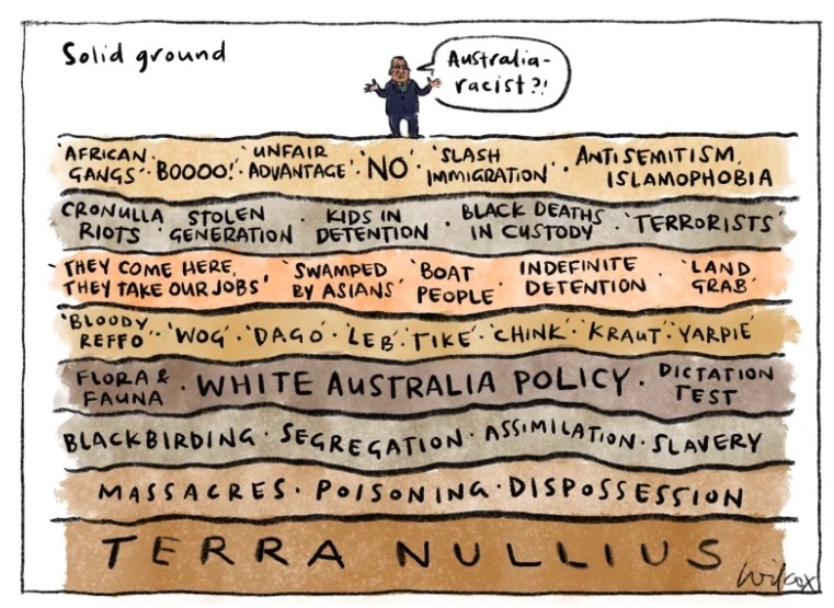 The very same rag that denies Australia has a racist past and a racist present, while Captain Spud roams the country terrifying people with tales of dastardly furriners, or confusing and conflating anti-Semitism with news of an ongoing genocide ...