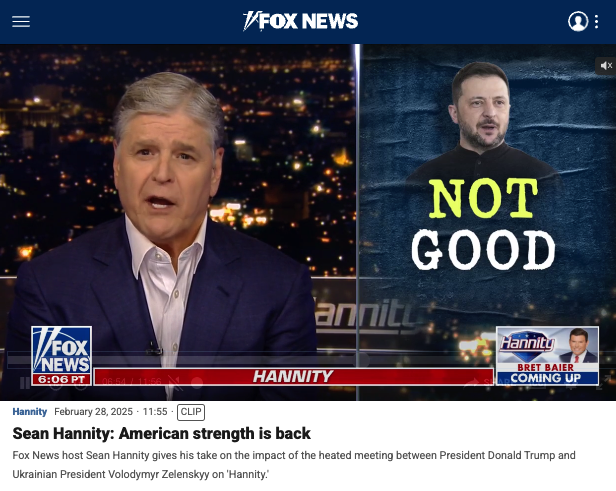 Hang on, hang on, that should have read Faux Noise was ecstatic at Zelensky’s humiliation...Hannity's triumphant rhetoric is par for the Murdochian Faux Noise hypocritical course ...