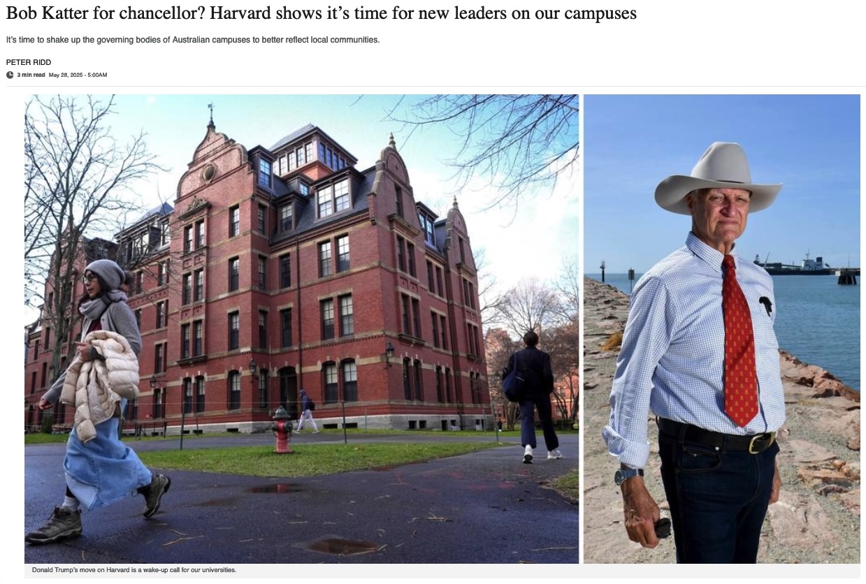 ... and yet what a relief, because the reptiles clocked Bob Katter for chancellor? Harvard shows it’s time for new leaders on our campuses, It’s time to shake up the governing bodies of Australian campuses to better reflect local communities as a mere three minute read.